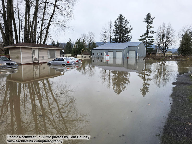 A photo/video timelapse music video of Day 1 of the Nooksack River 2025 (12/11/25) flood in West Sumas, Washington on 2nd street west of the tracks. From the start of the flood to its recession, the wildlife seeking dry ground, lumber pallets floating down the street, our building becoming an island, the US/Canada border closed, and the Coast Guard airlifting three neighbors across the street. Photography/Videography by Thomas Baurley, Techno Tink Media. Music: The Nooksack Rises | Suno | Rowan | Techno Tink Media. https://technotink.net/adventures/?p=7954